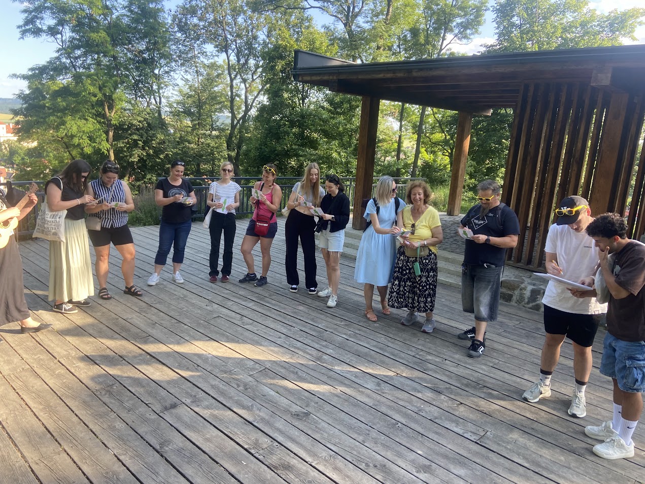 Minulý týden jste mohli v lesíku vidět velký zájezd žlutých brýlí. A co že to bylo za akci? Přece závěrečné setkání všech lektorů naší jazykovky. A jak už u nás bývá zvykem, nebyla to žádná nudná porada ani formální rozloučení. Bylo to setkání, kde se učíme, smějeme, slavíme a hlavně jsme spolu. Tentokrát jsme se vydali do terénu. Doslova.