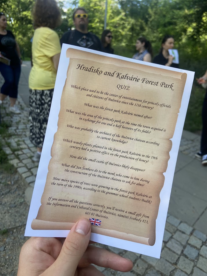 Začali jsme v lesoparku Kalvárie v Bučovicích – místě, které je krásné, klidné a... překvapivě plné zajímavých příběhů. A právě ty jsme společně objevovali při procházce s kvízem, který jsme jako jazykovka pomáhali překládat pro město Bučovice. Byla to taková malá výprava za vědomostmi: